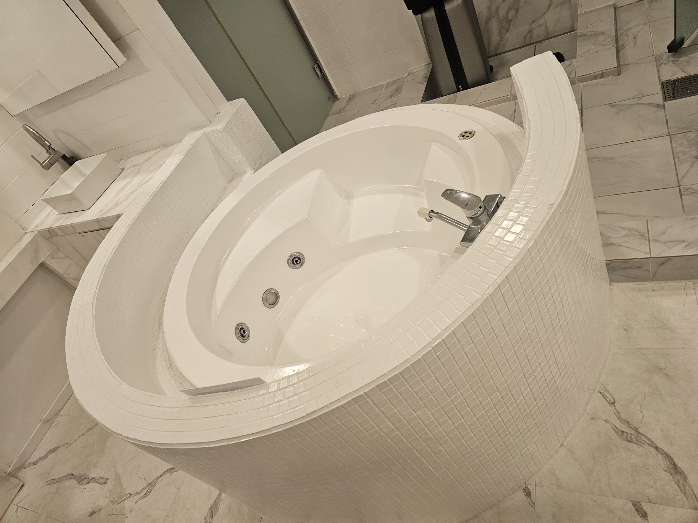 하센호텔의 가장 특이한 점은 욕실이 객실 내에 있는 오픈 구조라는 것입니다. 큰 원형의 욕조가 객실 한쪽에 자리해 있어 스파처럼 사용할 수 있게 설계됐지만, 아쉽게도 이번 방문 시에는 “사용 불가” 안내가 붙어 있어 이용하지 못했습니다. 욕조 안에는 제트 노즐이 있어 원래는 자쿠지 기능을 제공하는 듯했는데, 시설 관리 문제인지 사용할 수 없다고 안내를 받았습니다.