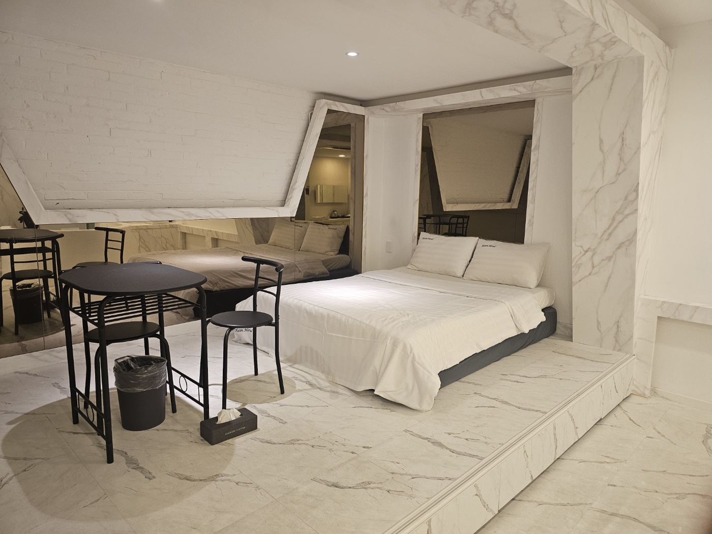 객실 한 켠에는 소형 테이블과 의자 두 개가 마련돼 있었는데, 크기가 크지는 않지만 노트북과 보조 모니터를 동시에 놓을 수 있을 정도로 공간이 확보돼 있어 간단한 작업이나 식사를 하기에 충분했습니다. 거울이 크게 설치돼 있어 화장이나 스타일링 시 편리했지만 거울 위치가 침대를 비추는 구조라 호불호가 갈릴 수 있습니다. 객실 내부에는 티슈와 휴지통, 벽걸이형 TV, 옷걸이 등이 준비되어 있었습니다.