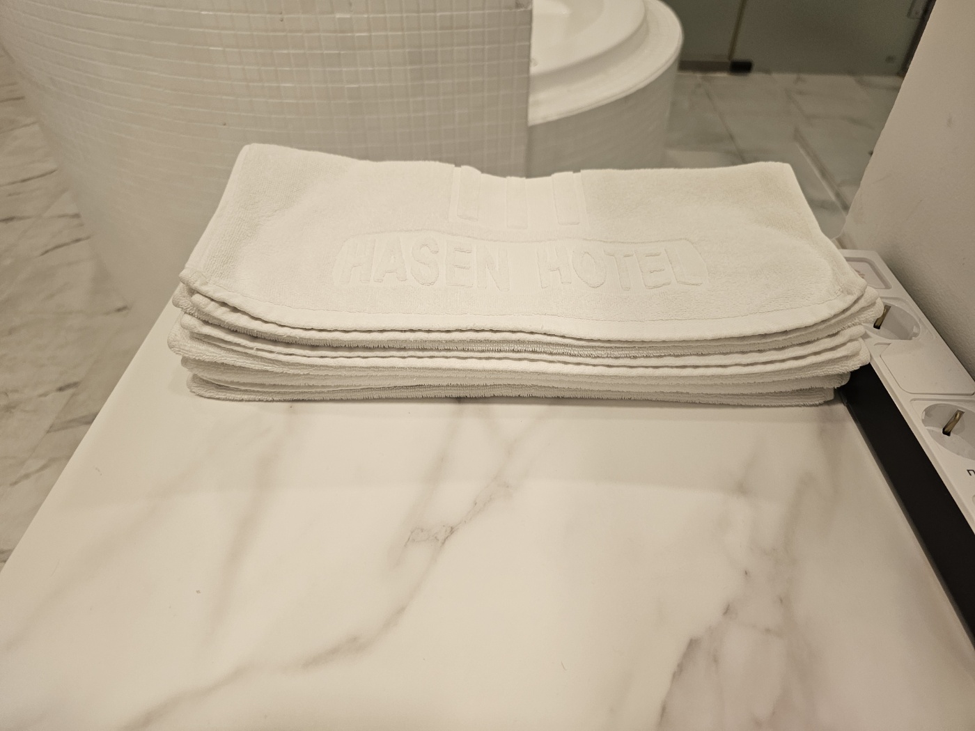수건은 얇은 면 타월 네 장이 제공되었는데, 촉감이 약간 거칠고 오래된 느낌이 있어 타월의 퀄리티는 아쉬웠습니다. 필요하면 여분을 요청해야 할 것 같아요. 또한 객실 내 콘센트 수가 적어 전기 제품을 여러 개 사용하기에는 부족했지만, 멀티탭이 하나 준비돼 있어 노트북, 휴대폰, 카메라 등을 동시에 충전할 수 있었습니다.