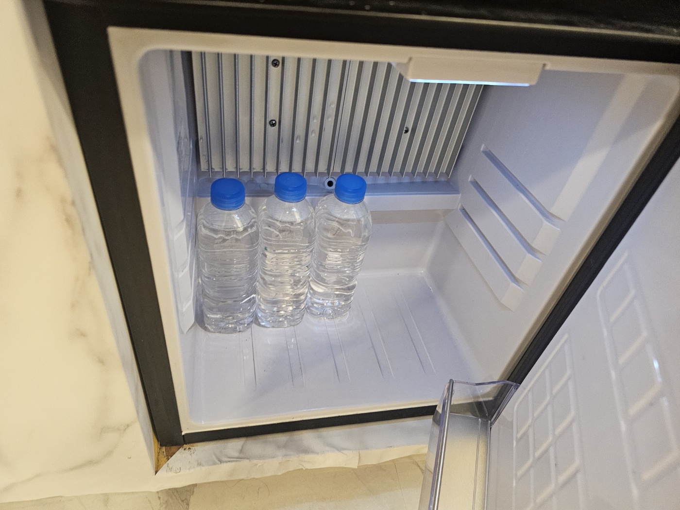 냉장고 안에는 500 ml 생수 3병이 준비돼 있어 더운 날 갈증 해소에 좋았습니다. 생수의 온도가 차가울 정도로 잘 냉장되어 있었고, 작은 과일이나 음료를 넣을 공간이 있을 정도로 내부 공간이 넉넉했어요.