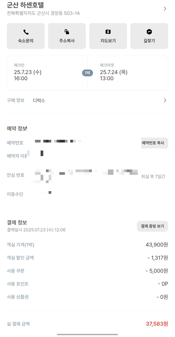 - 가격: 기본 객실 요금은 43,900원이었고 할인금액 1,317원과 쿠폰 5,000원을 적용해 총 37,583원에 예약했습니다. 군산 가성비 숙소를 찾는다면 이 정도 금액이면 만족스러운 편입니다.