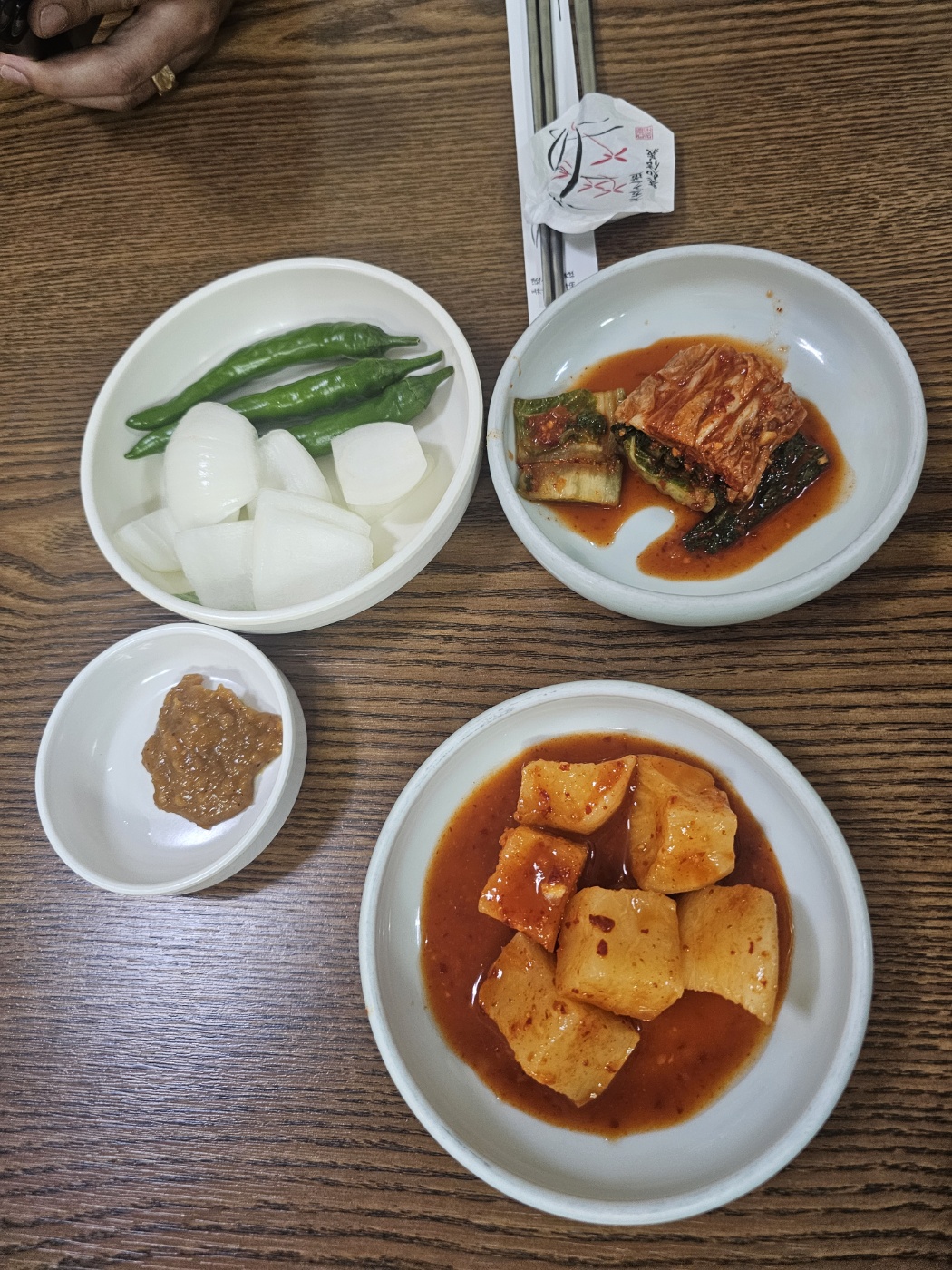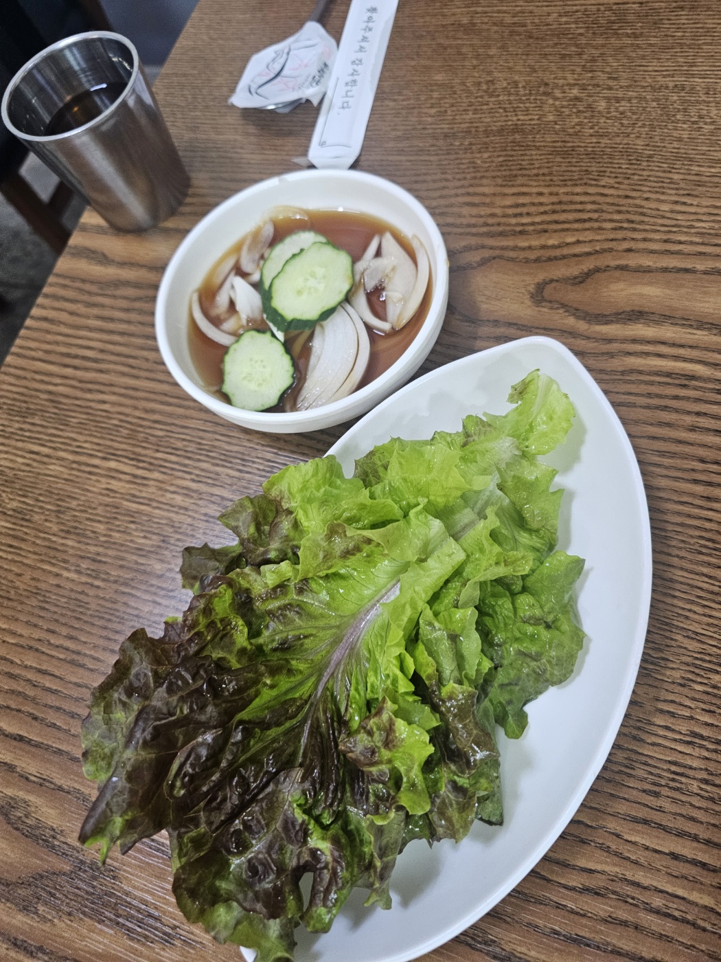 | 반찬 | 깍둑이 김치, 쌈장, 양파, 추가로 상추와 양파절임까지 — 술술 넘어가는 구성! |
