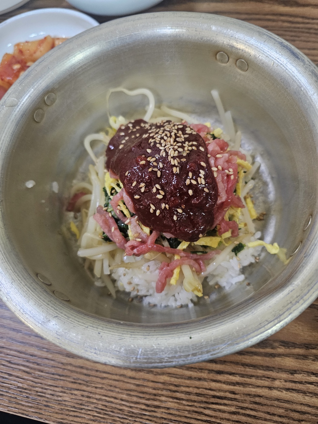 육회비빔밥은 양푼에 담겨 나오는데, 나물과 참기름, 고추장, 신선한 육회가 어우러져 정말 입맛 제대로 저격해요.