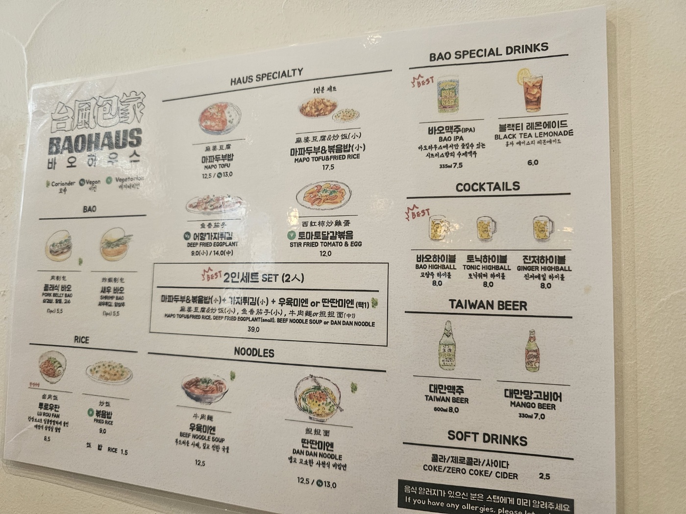 바오하우스는 아담하지만 생기 있고 활기찬 분위기가 매력적이에요. 마치 대만 길거리 식당 느낌이 물씬 나서, 음식 맛뿐 아니라 분위기까지 만족스럽답니다.