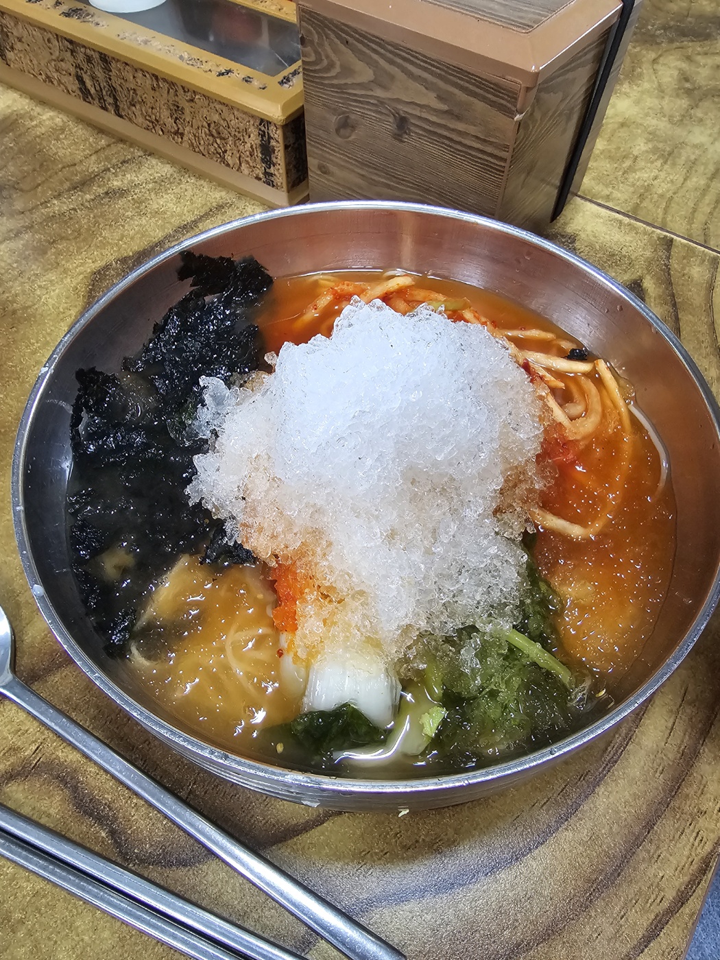 여름 한정 메뉴 느낌이 나는 빙수국수, 즉 냉국수 스타일이에요.