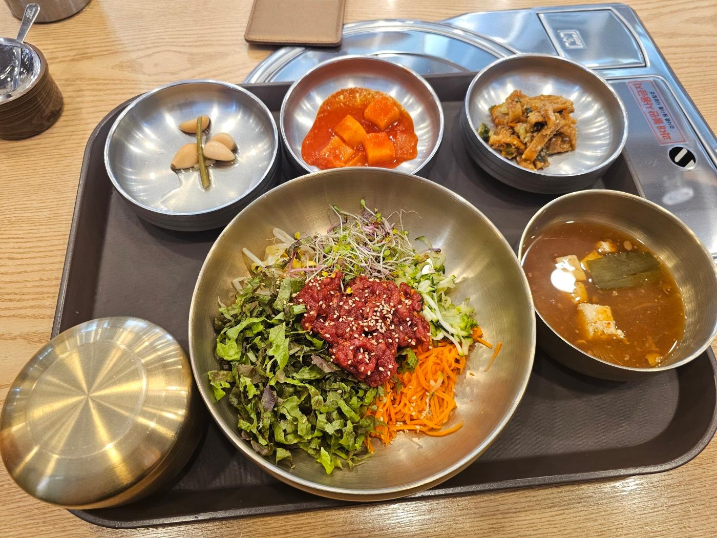육회비빔밥은 신선한 한우 육회가 넉넉하게 올려져 있고, 함께 나온 야채와 고소한 참기름 향이 어우러져 풍미가 좋았어요. 행사 가격이라 양이 줄었을까 걱정했는데, 생각보다 푸짐하게 나왔습니다. 다른 곳에서 먹는 육회비빔밥보다 차별화되는 점은 곁들여 나오는 반찬 구성이 은근히 다양하다는 점이에요.