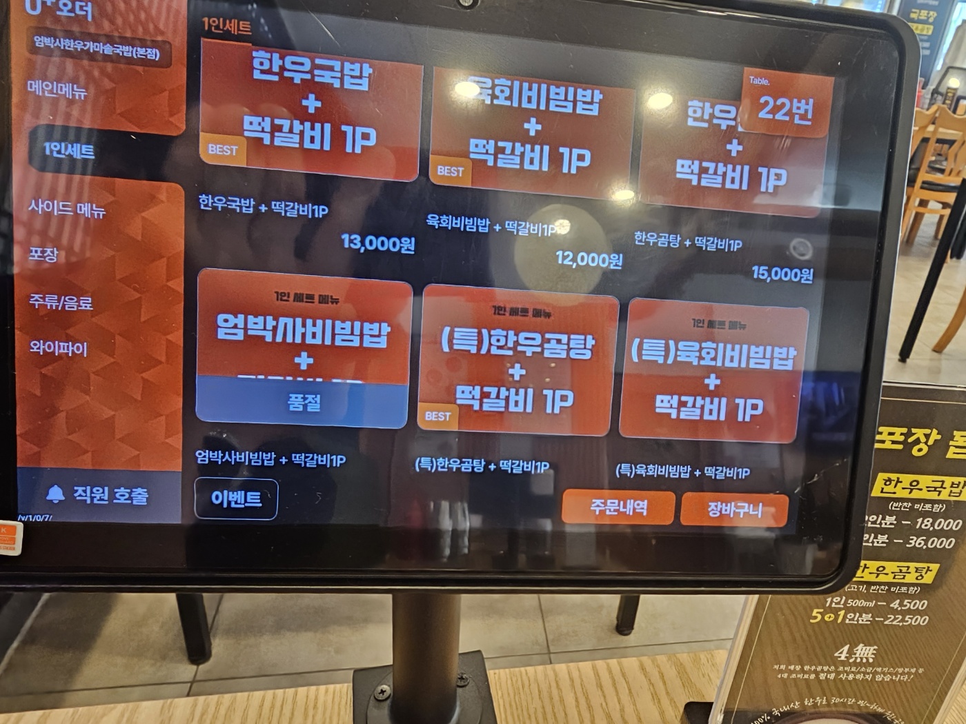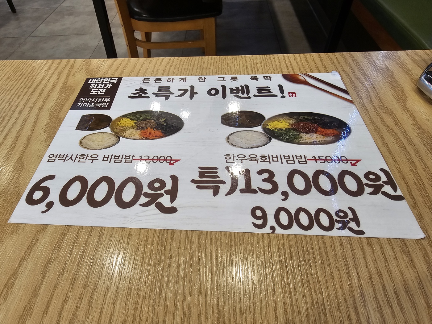 이번 방문에서는 몇 번 먹었던 한우국밥 대신, **한우 육회비빔밥(행사 가격 9,000원)**을 주문했어요. 정가 15,000원인데 행사 덕분에 저렴하게 즐길 수 있었죠.