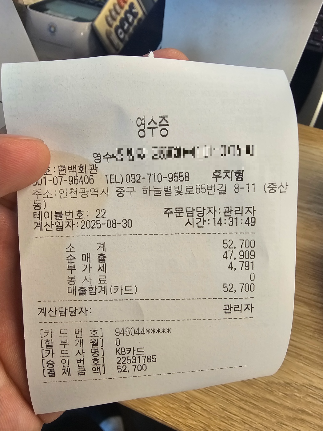 ☑ 이번 방문 인원은 성인 2명 + 초등학생 1명으로, 총 결제 금액은 52,700원이 나왔습니다.
