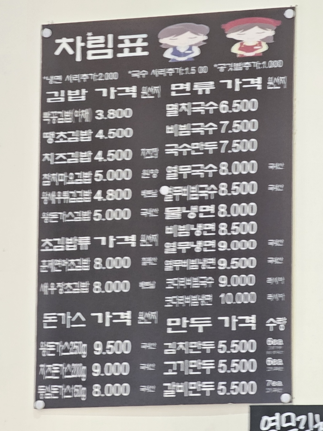 - 메뉴가 다양해서 선택 폭이 괜찮다는 평 (비빔국수, 열무국수, 돈까스김밥 등)