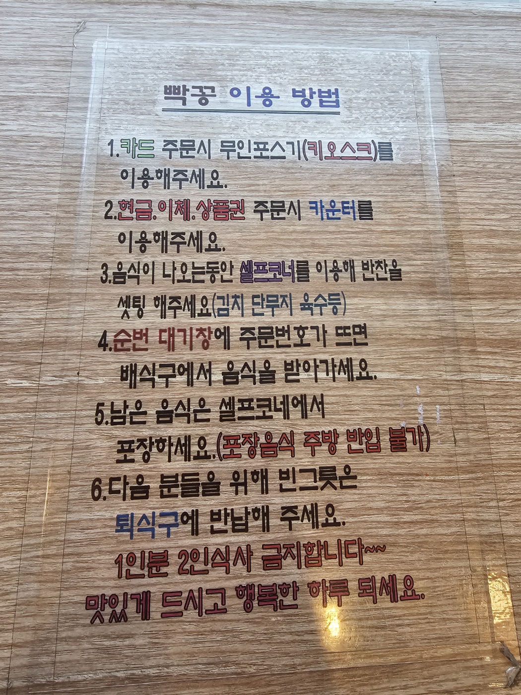 주문 방식은 키오스크 한 번 “툭” 눌러주고, 셀프바로 가서 단무지랑 김치 꺼내서 세팅.