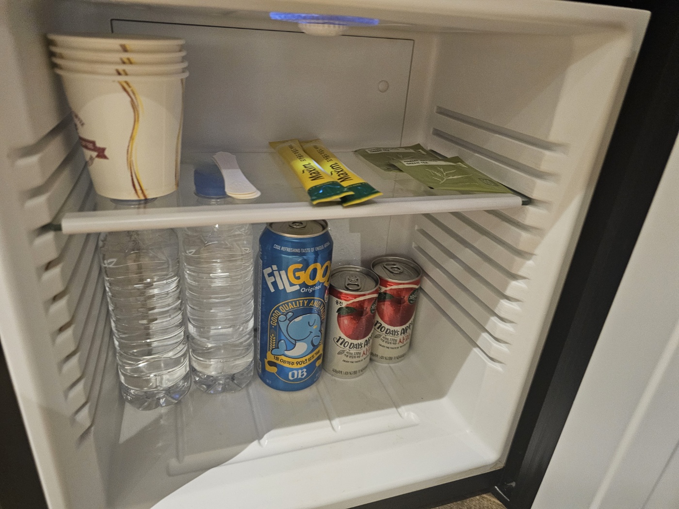 - ๋์ฅ๊ณ ๋ฌธ์ ์ด๋ฉด ๋ฌผ 2๋ณ, ๋งฅ์ฃผ 1์บ, ์๋ฃ 2๊ฐ, ์ปคํผ ๋ฏน์ค, ์ข ์ด์ปต ๋ฑ ๊ฝค ํธ์งํ๊ฒ ์ฑ์์ ธ ์์์ด.