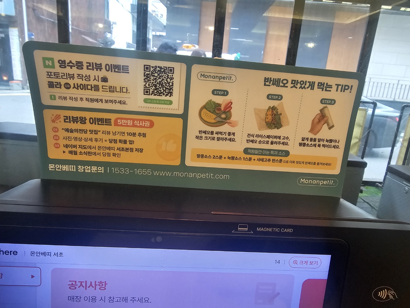 입구에 들어서면 메뉴판이 매장 앞 유리 혹은 입구 옆에서 잘 보이도록 배치되어 있어요. 이 덕분에 들어가기 전 메뉴 선택이 가능했고, 기다리는 동안 “어떤 걸 먹을까?”를 미리 고민할 수 있어서 좋았습니다.