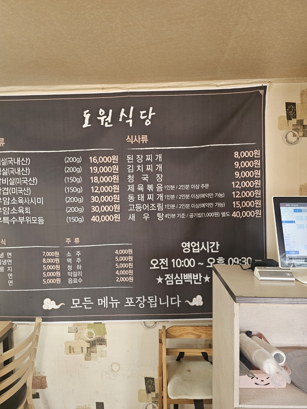 벽면에는 크게 메뉴판이 걸려 있고, 의자는 기본적인 원목 의자. 어떤 특별함을 기대하기보다는, 조용히 와서 밥 한 끼 먹고 가기 좋은 곳이라는 느낌이에요.