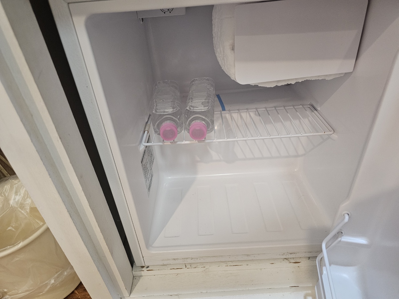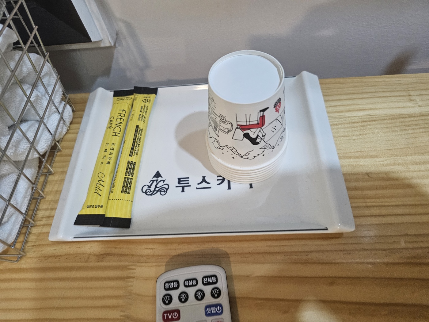 ๋์ฅ๊ณ ์๋ ์์ 2๋ณ์ด ๋ค์ด ์์๊ณ , ํ ์ด๋ธ ์์๋ ์ปคํผ๋ฏน์ค 2๊ฐ, ์ข ์ด์ปต, ์ ๊ธฐํฌํธ๊ฐ ์ค๋น๋์ด ์์ต๋๋ค.