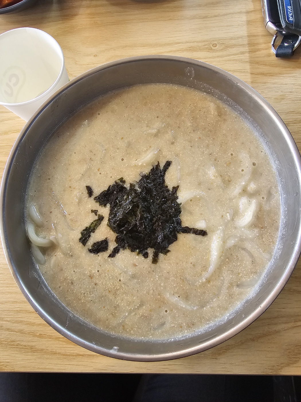 ํฐ ๊ทธ๋ฆ์ ๋ฌ๋ฟ ๋ด๊ธด ๊ตญ๋ฌผ๊ณผ ๊น๊ฐ๋ฃจ ํ ํ, ๊ทธ๋ฆฌ๊ณ ๋ถ๋๋ฌ์ด ๋ฉด๋ฐ์ด ์ ๋ง ๋ง์กฑ์ค๋ฌ์ ์ด์.