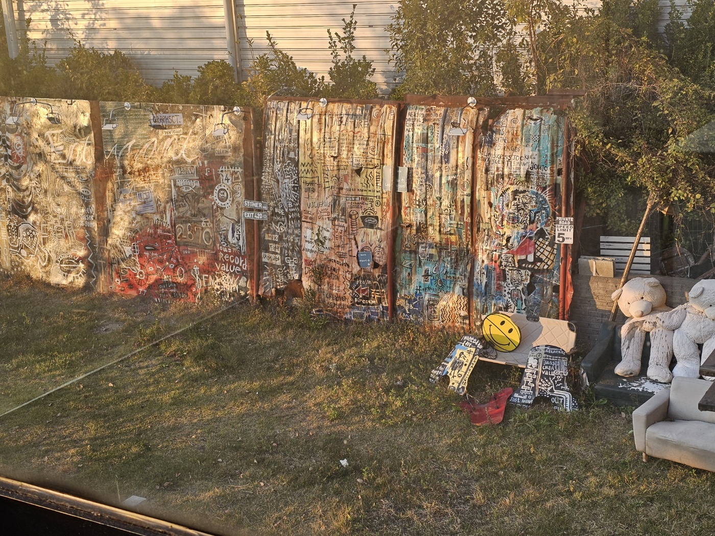카페 외부에는 그래피티 벽, 아트 조형물, 빈티지 오브제들이 깔려 있어